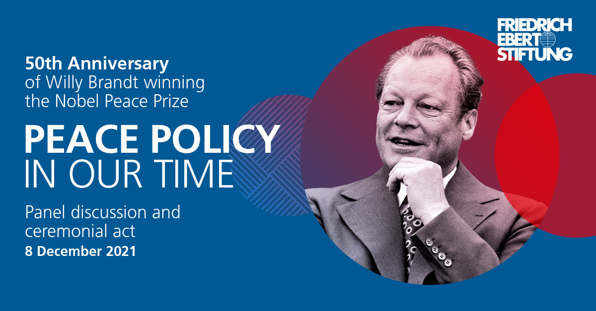 From 14:00-20:30 on 8 December 2021, 50 years after Willy Brandt was awarded the Nobel Peace Prize, the Friedrich-Ebert-Stiftung in cooperation with the Bundeskanzler-Willy-Brandt-Stiftung invites to a panel discussion and ceremonial act.
