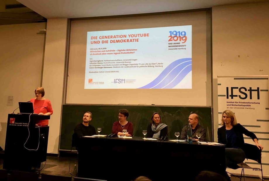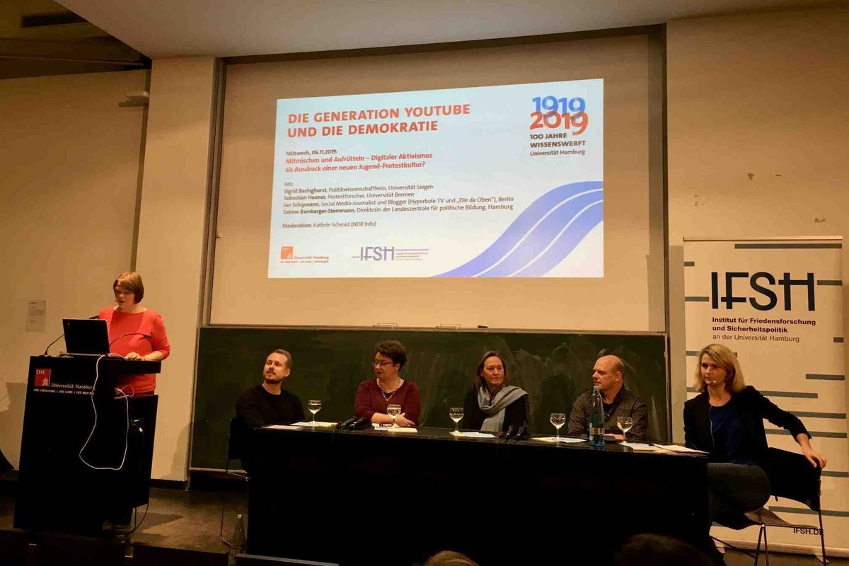 Die schwedische Klimaaktivistin Greta Thunberg ist zur Gallionsfigur einer neuen Protestbewegung geworden: Junge Leute politisieren sich und gehen wieder zu Zehntausenden auf die Straße, um zu demonstrieren. Sei es für mehr Klimaschutz oder gegen die EU-Urheberrechtsreform. Ein wichtiges Instrument für die politische Teilhabe von jungen Frauen und Männern ist das Internet. Insbesondere die sozialen Medien spielen eine zentrale Rolle. Der zweite Teil der IFSH-Diskussionsrunde stand deshalb unter dem Motto: „Mitmischen und Aufrütteln: Digitaler Aktivismus als Ausdruck einer neuen Jugend-Protestkultur?“. In welcher Weise befähigt die Digitalisierung Jugendliche zur politischen Meinungsäußerung und Mitgestaltung? Wie sollte die Politik diese Entwicklung nutzen, um das Interesse der „Generation YouTube“ an der Demokratie dauerhaft zu stärken?