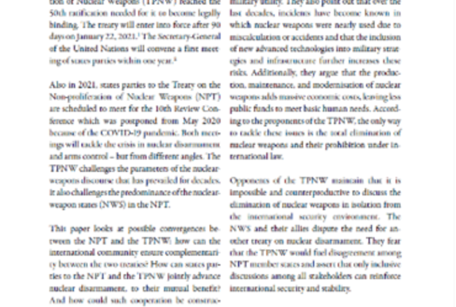Am 22. Januar 2021 tritt der Atomwaffenverbotsvertrag (AVV) in Kraft. Der UN-Generalsekretär wird nun innerhalb eines Jahres ein erstes Treffen der Vertragsstaaten einberufen. Ebenfalls im Jahr 2021 sollen die Vertragsstaaten des Nuklearen Nichtverbreitungsvertrags (NVV) zur 10. Überprüfungskonferenz zusammenkommen. Beide Treffen werden sich mit der Krise der nuklearen Abrüstung und Rüstungskontrolle befassen - allerdings aus unterschiedlichen Blickwinkeln. Wie kann die internationale Gemeinschaft sicherstellen, dass sich die beiden Verträge ergänzen? Wie können die Vertragsstaaten des NVV und des AVV gemeinsam die nukleare Abrüstung zu ihrem beiderseitigen Nutzen vorantreiben? Und wie könnte sich eine solche Zusammenarbeit konstruktiv in den Ergebnissen der 10. Überprüfungskonferenz des NVV widerspiegeln? Eine ausführliche Analyse bietet der Issue Brief von Lina-Marieke Hilgert, Angela Kane und Anastasia Malygina - nachzulesen auf der Deep-Cuts-Projekt-Webseite hier.