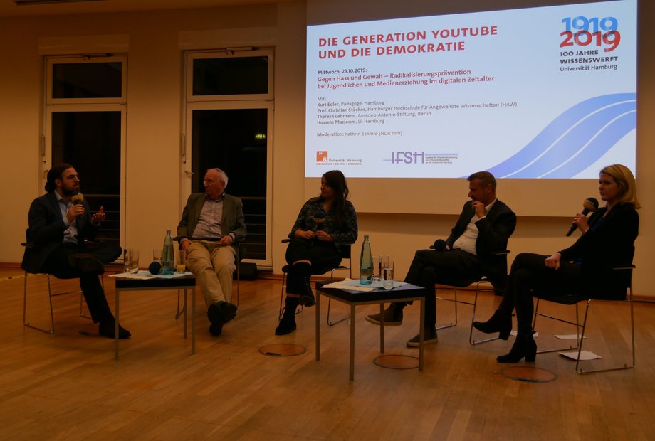 Diese Fragen diskutierten Kurt Edler, Lehrer und langjähriger Vorsitzender der Deutschen Gesellschaft für Demokratiepädagogik, Christian Stöcker, Journalist und Professor für Digitale Kommunikation an der Hamburger Hochschule für Angewandte Wissenschaften (HAW), Theresa Lehmann von der Amadeu-Antonio-Stiftung und Hussein Mazloum vom Landesinstitut für Lehrerbildung und Schulentwicklung. Kathrin Schmid (NDR Info) moderierte die Veranstaltung.