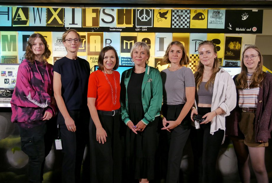 Die Hamburger Staatsrätin Dr. Eva Gümbel (3. von links) besucht das "Peace Jam" Games Kiosk am Eröffnungstag der Millerntor Gallery.