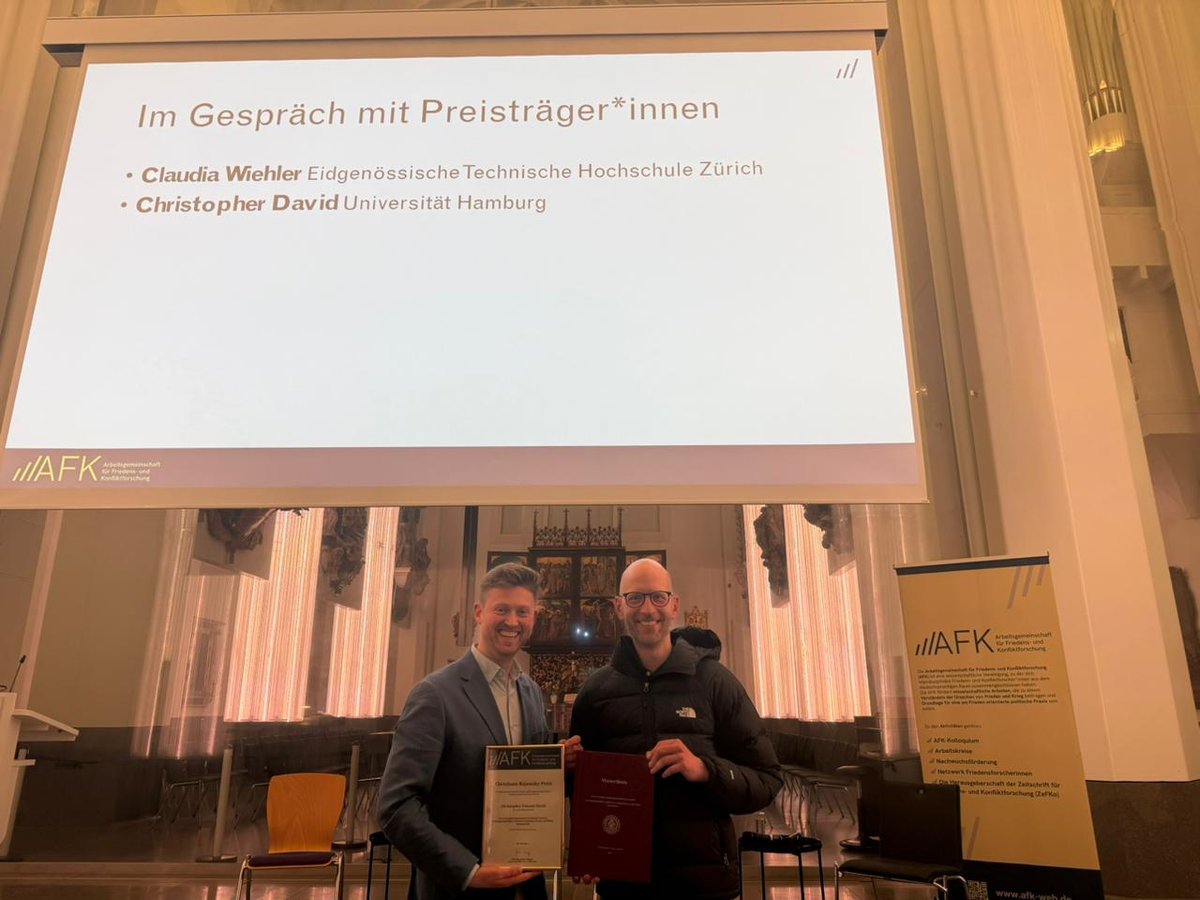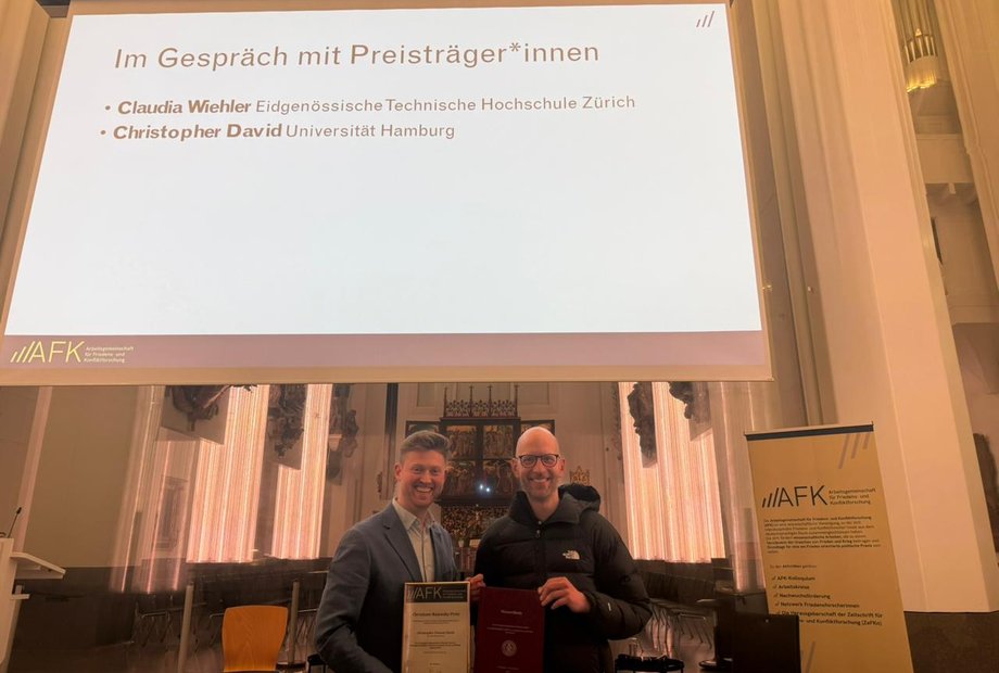 Christopher David erhielt am 11. März im Rahmen des jährlichen Kolloquiums der Arbeitsgemeinschaft für Friedens- und Konfliktforschung (AFK) in Leipzig den Christiane Rajewsky-Preis. Er wurde für die beste Masterarbeit des Jahres im Feld der Friedens- und Konfliktforschung im deutschsprachigen Raum ausgezeichnet.