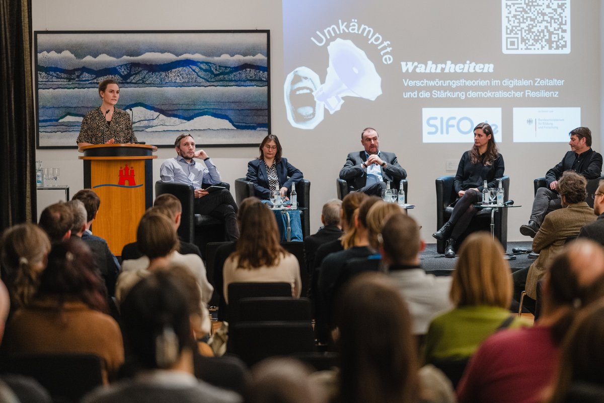 Die anschließende öffentliche Diskussionsveranstaltung mit dem Titel „Umkämpfte Wahrheiten: Verschwörungstheorien im digitalen Zeitalter und die Stärkung demokratischer Resilienz“ war mit mehr als 80 Teilnehmenden ausgebucht.