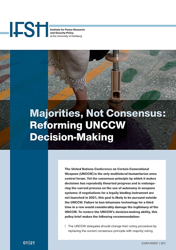Die UN-Konferenz über inhumane Waffen (UNCCW) tut sich schwer mit der Verabschiedung völkerrechtlich bindender Verträge. Auch der aktuelle Prozess zur Regulierung autonomer Waffensysteme läuft Gefahr zu scheitern. Umso dringender stellt sich die Frage, wie die Entscheidungsfähigkeit der UNCCW verbessert werden kann. Elvira Rosert schlägt deshalb vor: Das Konsensprinzip, nach dem die UNCCW traditionell abstimmt, sollte durch Mehrheitsentscheidungen ersetzt werden.