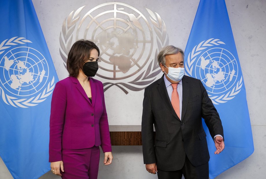 Bundesaußenministerin Annalena Baerbock trifft am Rande der Generaldebatte der Überprüfungskonferenz UN-Generalsekretär Antonio Guterres zum Gespräch. (c) dpa Pictura Alliance | Janine Schmitz