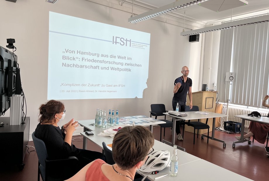 Im Juli 2022 waren Dr. Hendrik Hegemann (Referent im Bild) und Reem Ahmed "Komplizen für die Zukunft" der Volkshochschule Hamburg. (c) IFSH