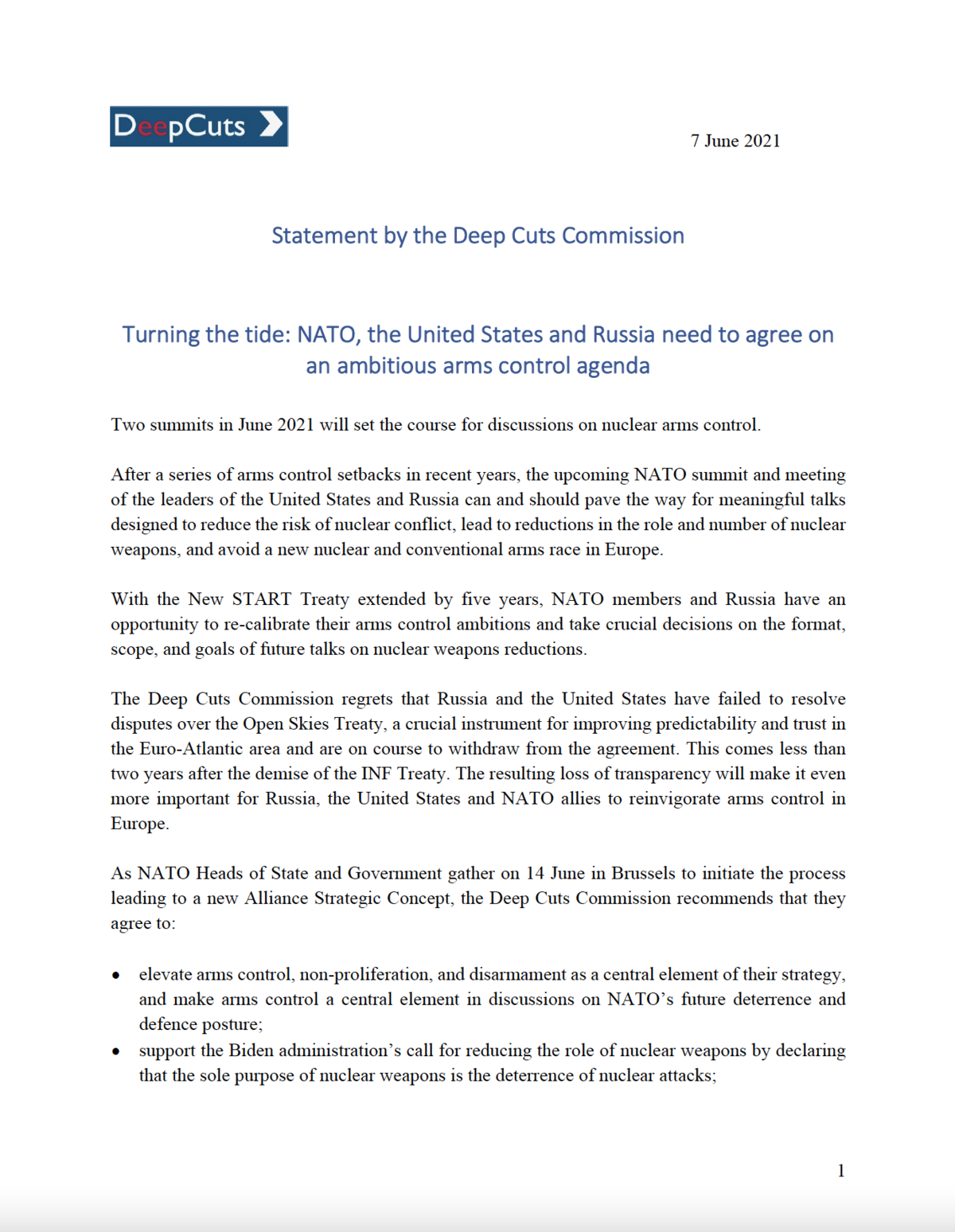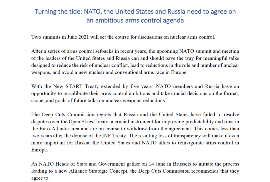 Zwei Gipfeltreffen im Juni 2021 werden den Ton für Gespräche über nukleare Rüstungskontrolle angeben. Nach einer Reihe von Rückschlägen im Bereich der Rüstungskontrolle in den letzten Jahren können und sollten der bevorstehende NATO-Gipfel und das Treffen der Präsidenten der Vereinigten Staaten und Russlands den Weg für substanzielle Gespräche ebnen, die darauf abzielen, das Risiko eines nuklearen Konflikts zu reduzieren, zu einer Verringerung der Rolle und Anzahl von Atomwaffen zu führen und ein neues nukleares und konventionelles Wettrüsten in Europa zu vermeiden.