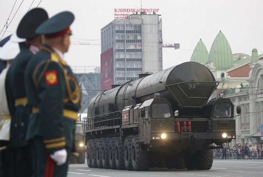 Auf einer russischen Militärparade wird eine ballistische Interkontinentalrakete vom Typ RS-24 Yars präsentiert.