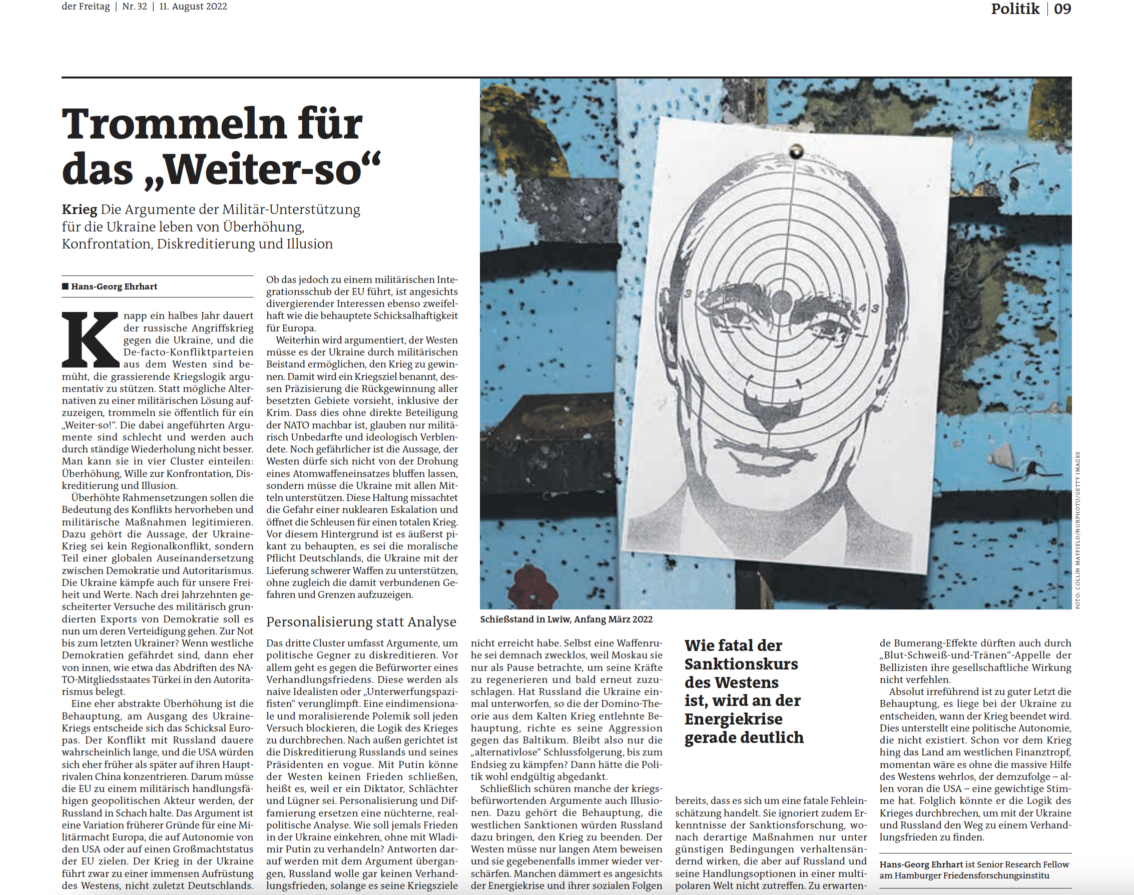 Knapp ein halbes Jahr nach dem russischen Angriffskrieg gegen die Ukraine ist noch kein Frieden in Sicht. Die unmittelbaren Kriegsparteien sind ineinander verhakt und geben sich kompromisslos. Die de facto-Kriegsparteien aus dem Westen und ihre medialen Helfer seien bemüht, die grassierende Kriegslogik argumentativ zu unterstützen, so Hans-Georg Ehrhart in seinem neuesten Gastbeitrag für die Wochenzeitung der Freitag. Statt Wege aus der vertrackten Lage zu diskutieren und mögliche Alternativen zu einer militärischen Lösung aufzuzeigen, trommelten sie in der Öffentlichkeit für ein „Weiter so!“. Die dabei angeführten Argumente seien schlecht und würden auch durch ständige Wiederholung nicht besser, kritisiert der Friedensforscher. Man könne sie in vier Cluster einteilen: Überhöhung, Konfrontationsnotwendigkeit, Diskreditierung, Illusion.