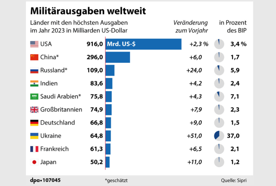 Mit knapp 2,3 Billionen Euro haben Staaten weltweit im vergangenen Jahr so viel Geld für Rüstung ausgegeben wie noch nie zuvor. Diese Zahlen gehen aus dem jüngst vorgelegten Bericht des schwedischen Friedensforschungsinstituts SIPRI hervor.