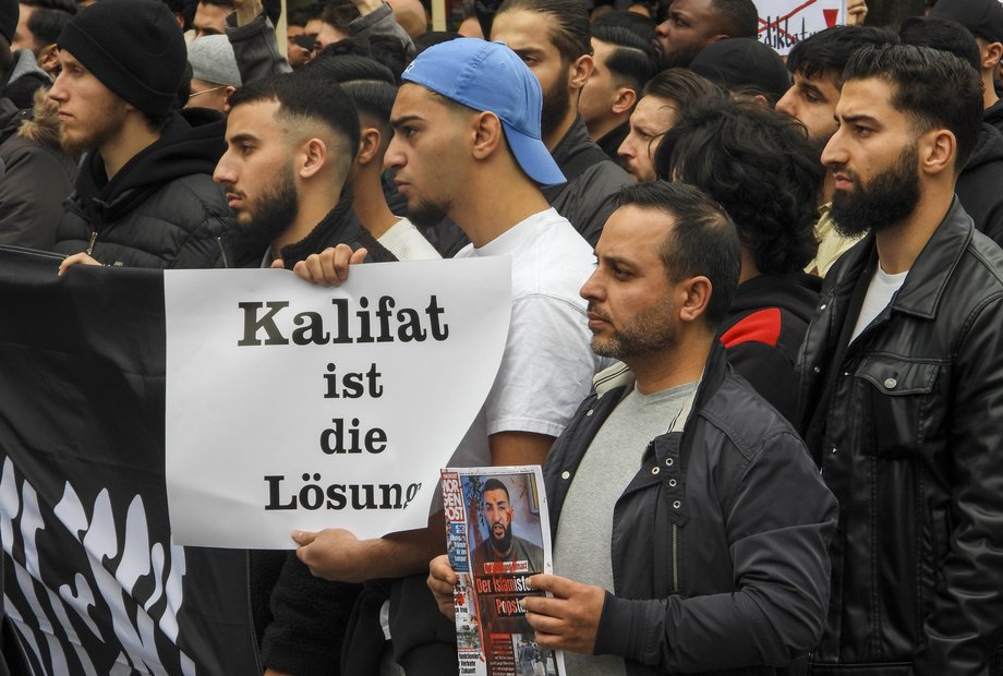 Im April 2024 demonstrierten mehrere hundert Anhänger von "Muslimaktiv" auf dem Hamburger Steindamm. Dabei forderten sie u.a. die Errichtung eines Kalifats in Deutschland. (c) dpa Picture Alliance | ABBfoto
