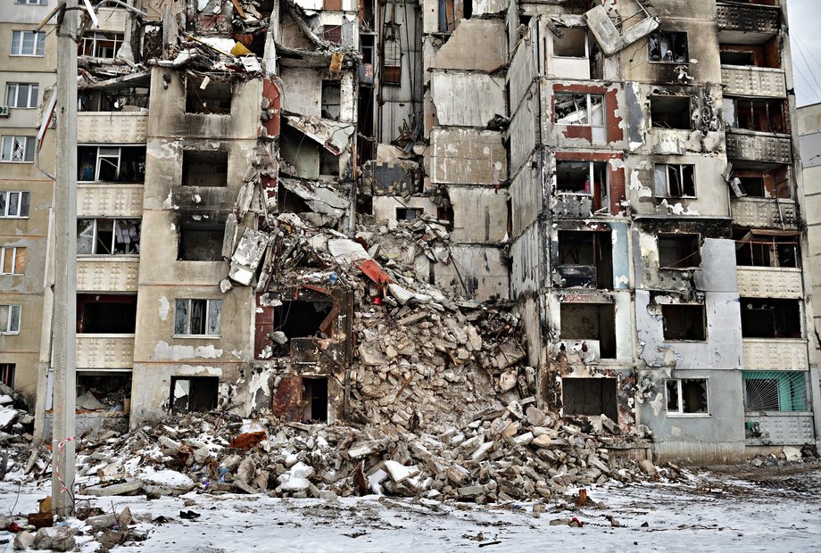 Ein fast vollständig zerstörtes Wohnhaus im ukrainischen Charkiw (c) dpa Picture Alliance | Daniel Kubirski